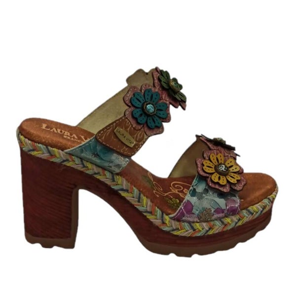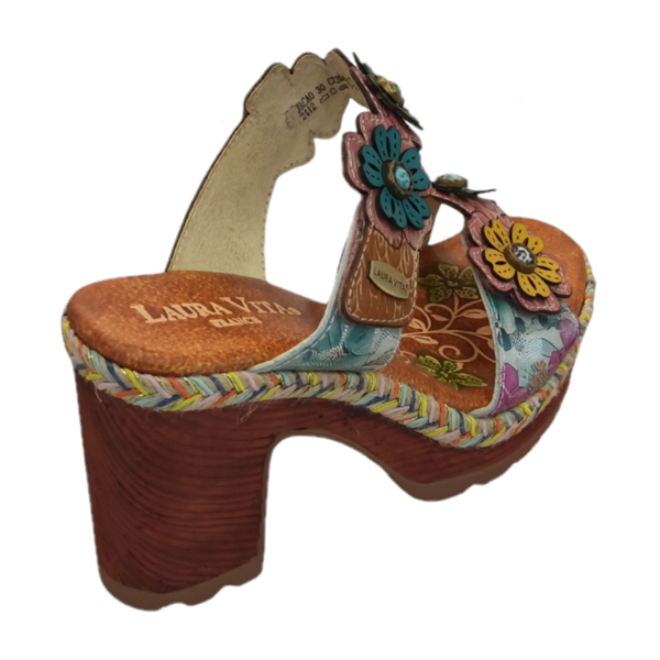 Scopri l'eleganza bohémien con questi sandali Laura Vita Jacao, un'espressione di stile artistico e comfort. Caratterizzati da un tacco alto di 10 cm e un plateau intrecciato multicolore che aggiunge un tocco di originalità, questi sandali sono un vero capolavoro artigianale. Le fasce regolabili a strappo garantiscono una calzata personalizzata, mentre i deliziosi fiori decorativi in diverse tonalità - turchese, verde, giallo e rosa - creano un effetto visivo accattivante. La base in legno con dettagli intrecciati multicolore aggiunge un elemento di design unico. Perfetti per le giornate estive, questi sandali combinano praticità e stile con un'estetica floreale distintiva. Il design della suola assicura stabilità e comfort durante la camminata, rendendo questi sandali ideali sia per occasioni speciali che per l'uso quotidiano.