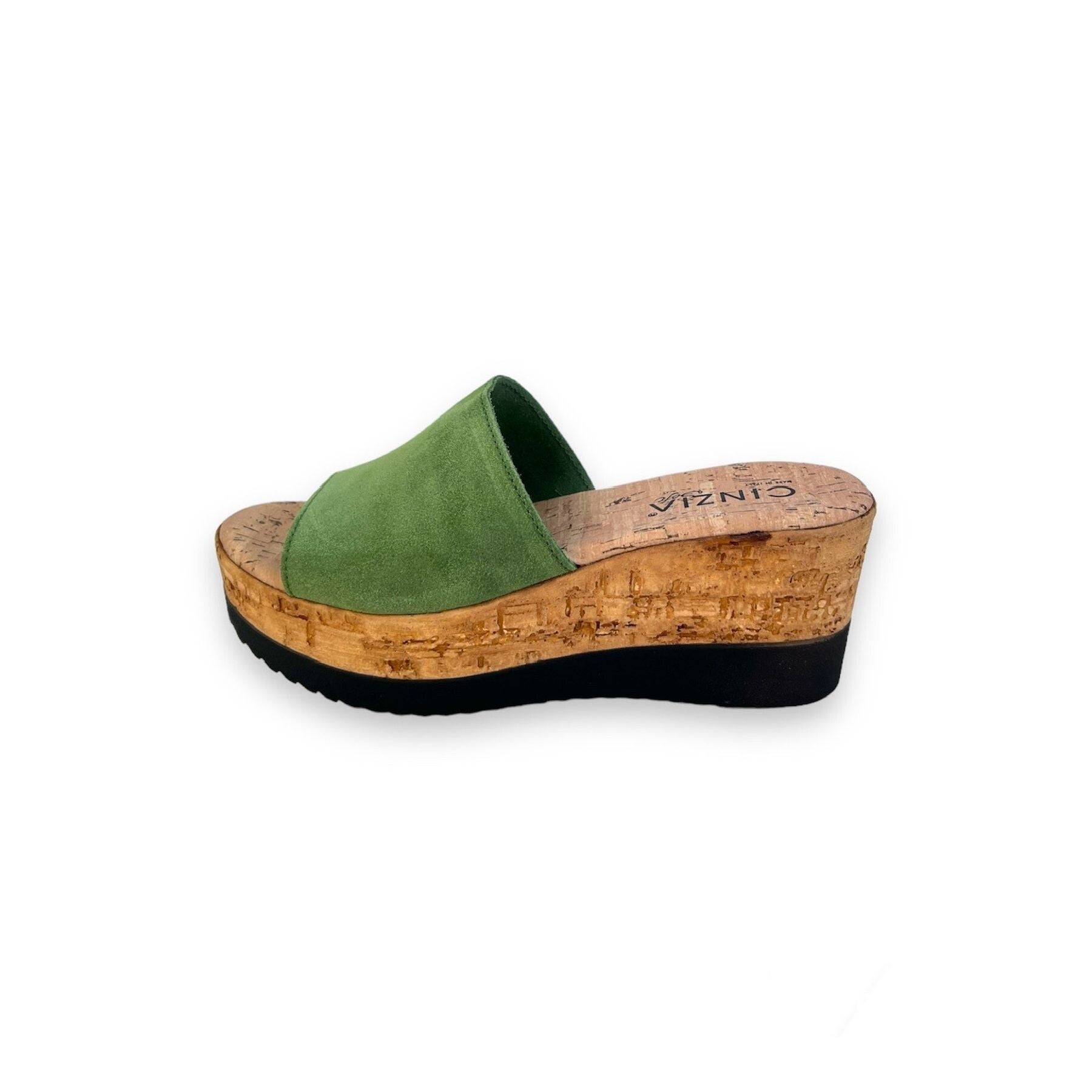Cinzia Soft Sandalo Scalzato in Camoscio Verde o Giallo con Soffice Sottopiede e Zeppa in sughero 7 cm.