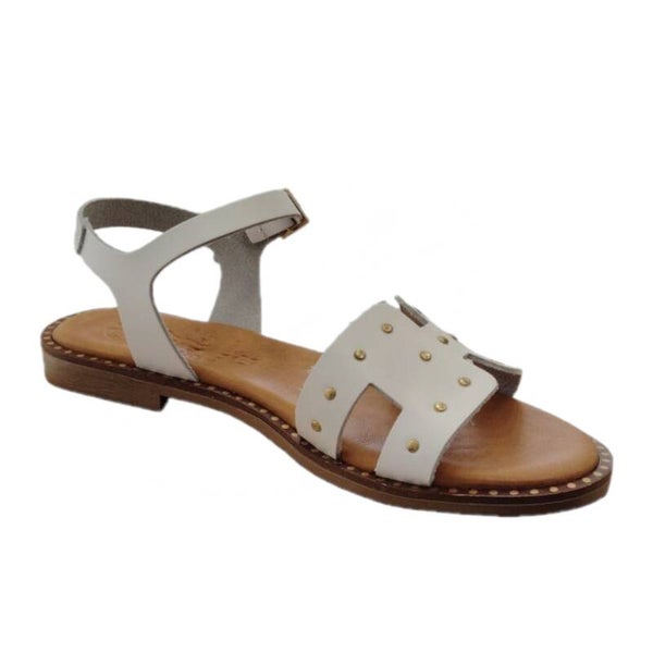 Sandalo in Pelle colore Bianco , con Cinturino Regolabile e Borchette colore Oro sulla tomaia che lo Impreziosiscono Rendendolo adatto ad Ogni Stile. Il Soffice Plantare in Memory assicura un passo Leggero e Confortevole.