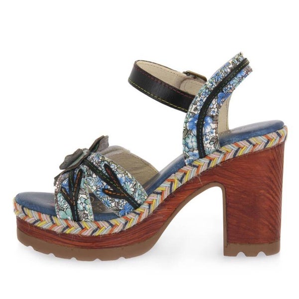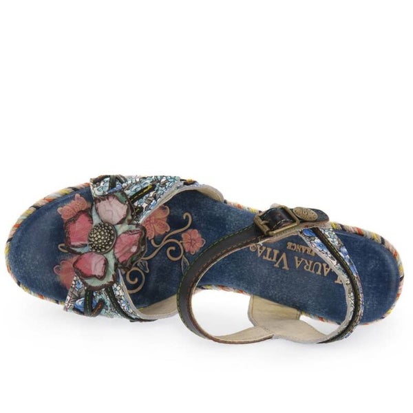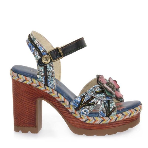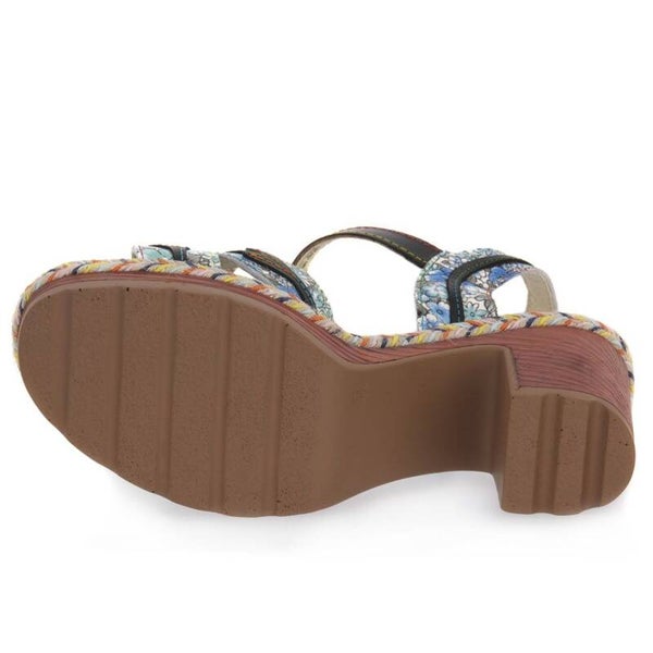 Questi sandali estivi dal design artistico sono un'espressione di stile bohémien e comfort. Caratterizzati da un motivo floreale vivace e dettagli decorativi intricati, presentano una tomaia in pelle con una distintiva decorazione a fiore. Il tacco alto e robusto, abbinato a un platform con bordo a contrasto , offre stabilità e altezza. La suola in legno aggiunge un elemento naturale al design, mentre il cinturino alla caviglia regolabile con strappo assicura una vestibilità personalizzata. La combinazione di colori blu e rosa e toni di verde e giallo paglierino crea un accessorio versatile perfetto per outfit estivi. Il Plateau e il tacco di circa 10 centimetri donano eleganza mantenendo il comfort per tutto il giorno. Ideali per occasioni casual-chic o eventi all'aperto, questi sandali aggiungono un tocco di originalità a qualsiasi outfit.