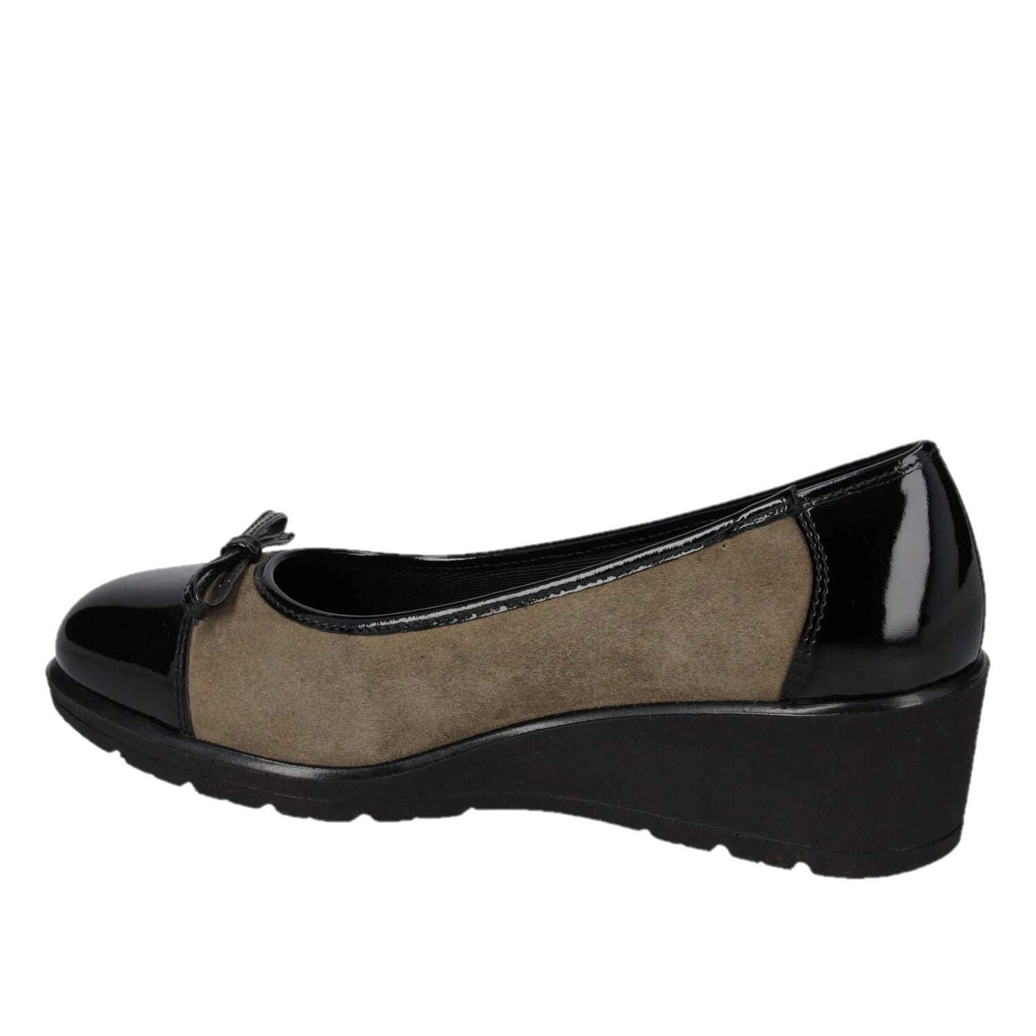 • DESIGN ELEGANTE: Scarpe da donna con zeppa in pelle verniciata nera e taupe, perfette per un look casual-chic e sofisticato