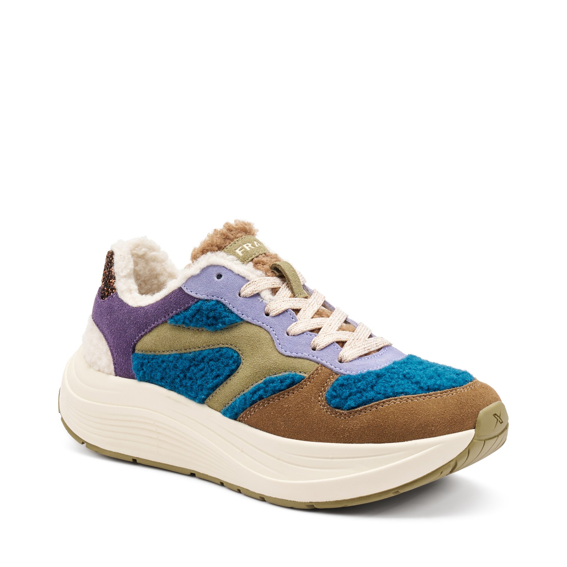 - DESIGN UNICO: Sneakers CrossHybrid in camoscio multicolore con inserti in tessuto teddy, dettagli glitter e combinazione di tonalità blu, viola e beige