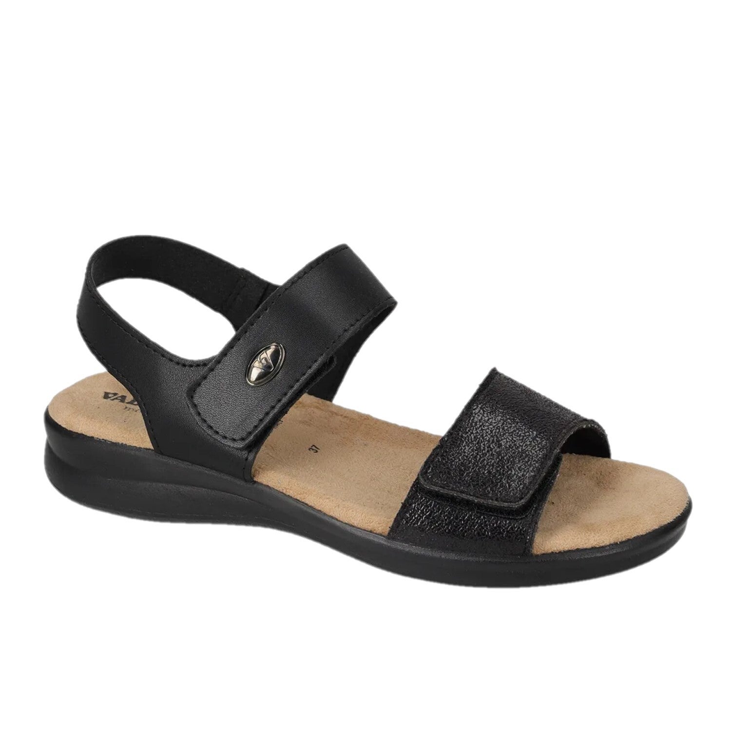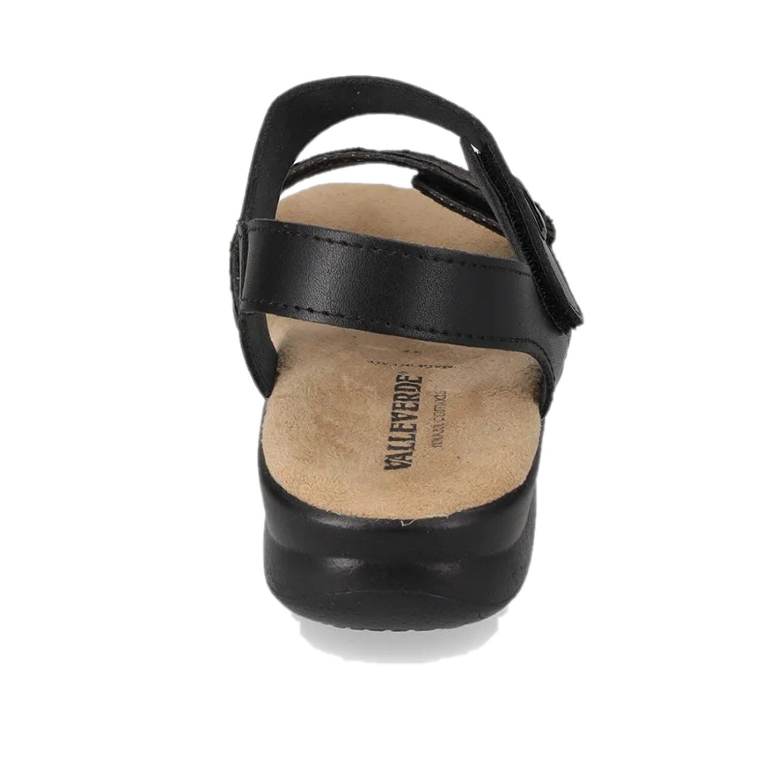 Sandalo da donna colore Nero con il sottopiede morbido e la tomaia in pelle, doppia chiusura con strappo e suola in gomma. Zeppa di 3 cm. Sandalo pensato e studiato nel pieno rispetto dell’anatomia del piede.