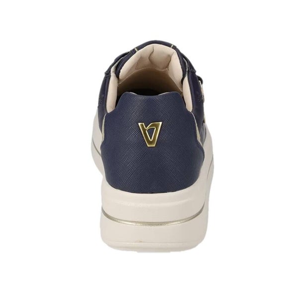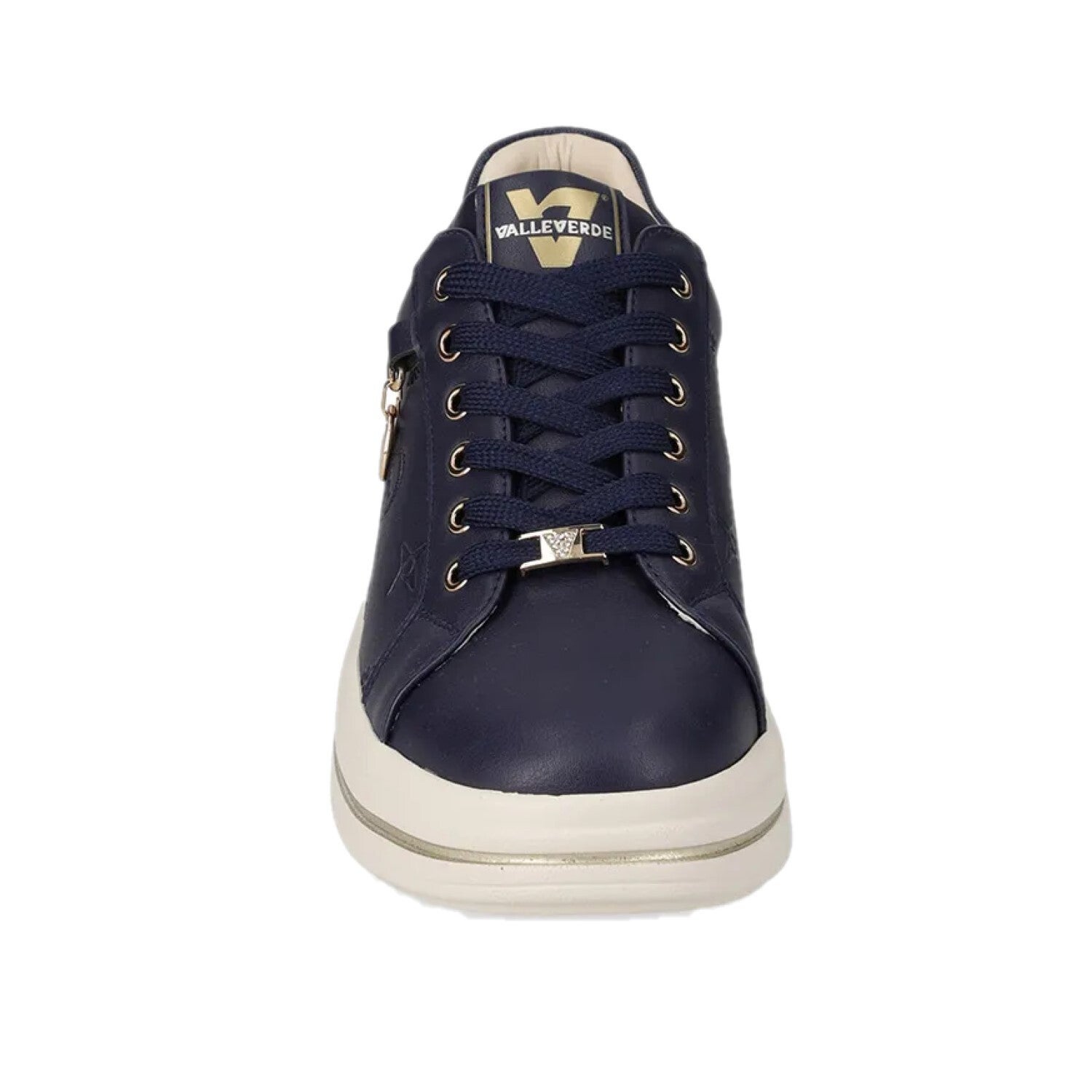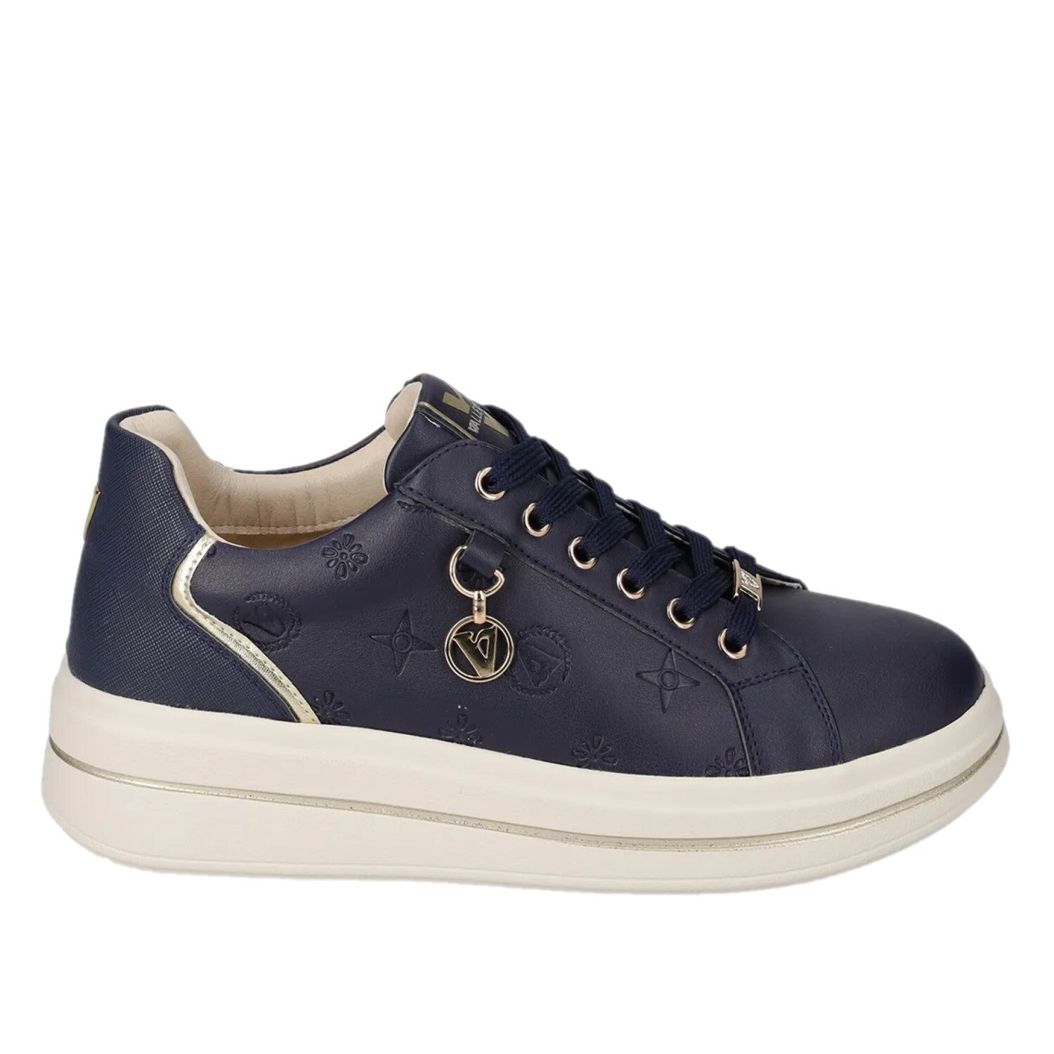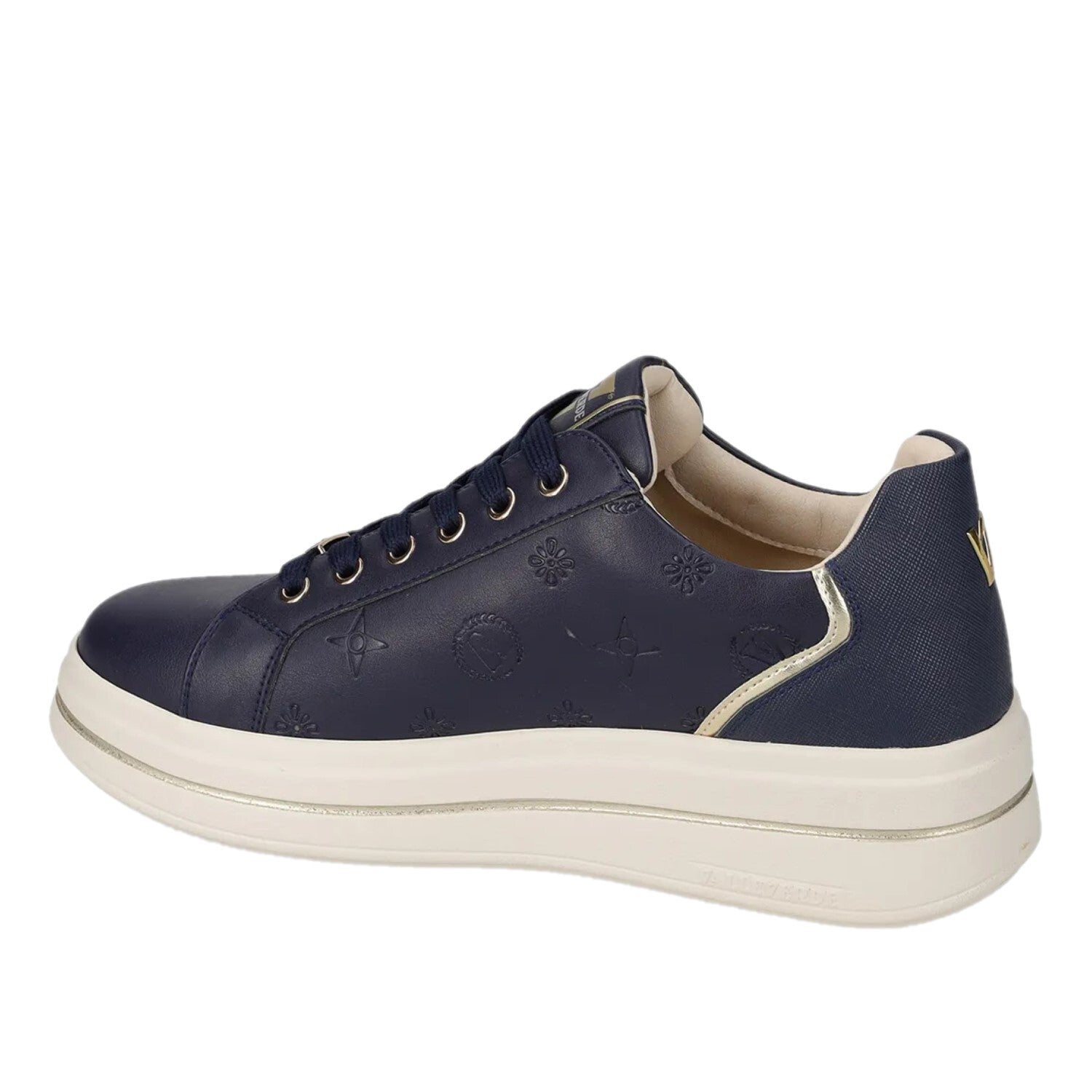 Le sneakers Valleverde 35494L sono la scelta perfetta per la donna moderna che desidera unire stile e comfort in ogni occasione. Disponibili nelle eleganti colorazioni blu navy e crema, queste scarpe si distinguono per il loro design raffinato e ricercato. La tomaia in pelle morbida è impreziosita da motivi in rilievo che includono il logo del brand, conferendo un tocco di originalità e classe. Il dettaglio del ciondolo dorato con logo agganciato ai lacci aggiunge un tocco di lusso discreto. I lacci abbinati al colore della scarpa, gli occhielli dorati e il profilo laterale in materiale laminato oro completano un look sofisticato. Il platform da 5 cm garantisce un'altezza aggiuntiva senza rinunciare al comfort, mentre la suola chiara offre un contrasto elegante. Ideali da abbinare sia a outfit casual che a look più ricercati, queste sneakers sono un must-have per ogni guardaroba femminile.