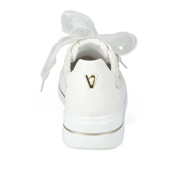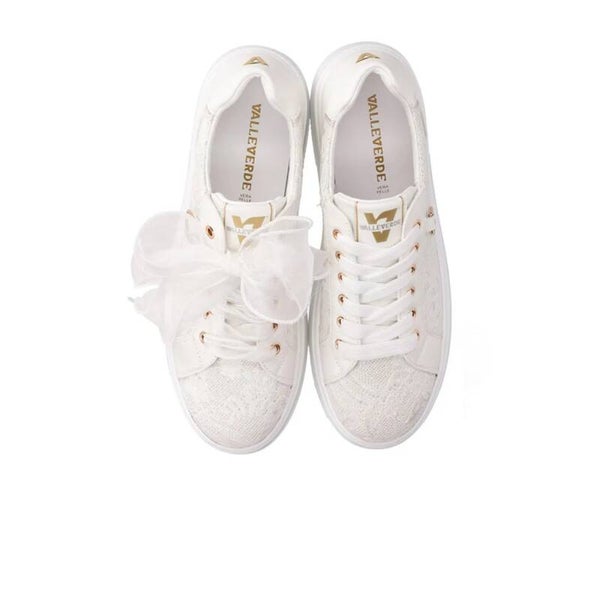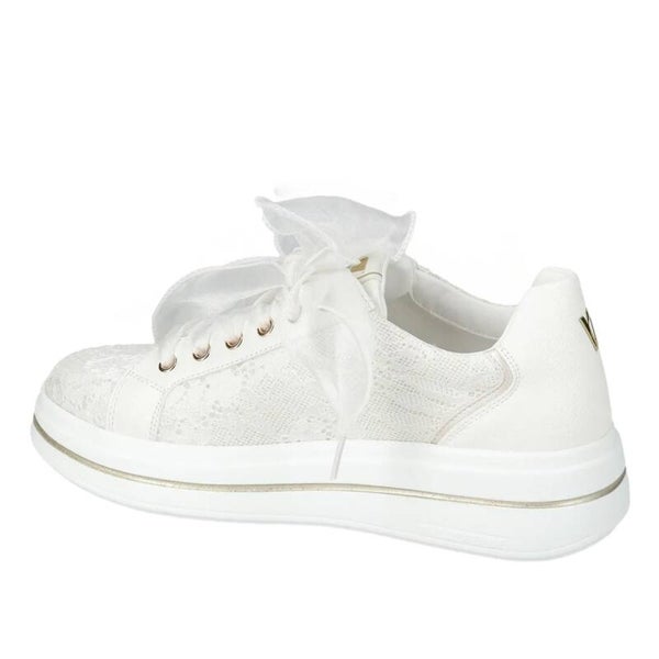 Le sneakers Valleverde 35496 sono l'accessorio perfetto per chi desidera unire comfort e stile in un unica calzatura. Realizzate in un elegante colore bianco, queste scarpe da donna si distinguono per il raffinato inserto in pizzo che riveste la tomaia, conferendo un tocco femminile e sofisticato. I lacci in organza aggiungono un dettaglio romantico e originale, mentre i preziosi dettagli dorati — tra cui gli occhielli e il ciondolo con logo — impreziosiscono ulteriormente il design. La suola platform bianca con sottile bordatura dorata garantisce un'altezza aggiuntiva e una camminata confortevole. Il tallone è rifinito con un inserto in pelle bianca e un logo dorato, completando l'estetica elegante del modello. Ideali per occasioni speciali o per un look quotidiano ricercato, queste sneakers si abbinano perfettamente a abiti, gonne o jeans.